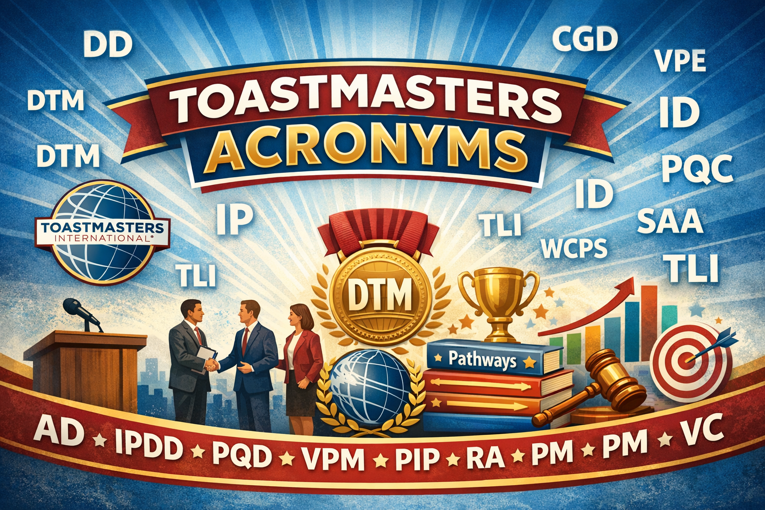 Toastmasters is full of acronyms—titles, roles, programs, and recognitions that can feel overwhelming at first. This page is your quick-reference guide to the most commonly used Toastmasters acronyms, helping you understand what they mean and how they fit into the organization.